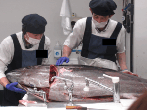 鮮度抜群の生まぐろをその場で解体、順次販売いたします。